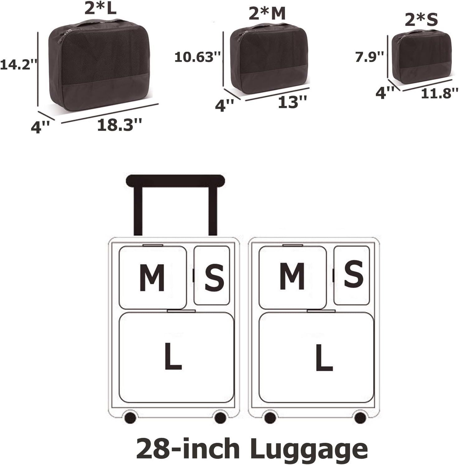 Estas bolsas organizadoras são projetadas para caber perfeitamente em malas de 28 polegadas (71,12 cm), oferecendo um ajuste ideal e ajudando a otimizar o espaço interno do compartimento. Seus benefícios incluem facilidade de uso, acesso rápido aos itens guardados e redução drástica de bagunça, garantindo paz de espírito em suas viagens.