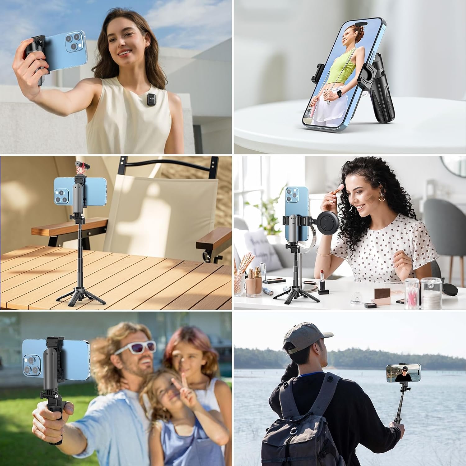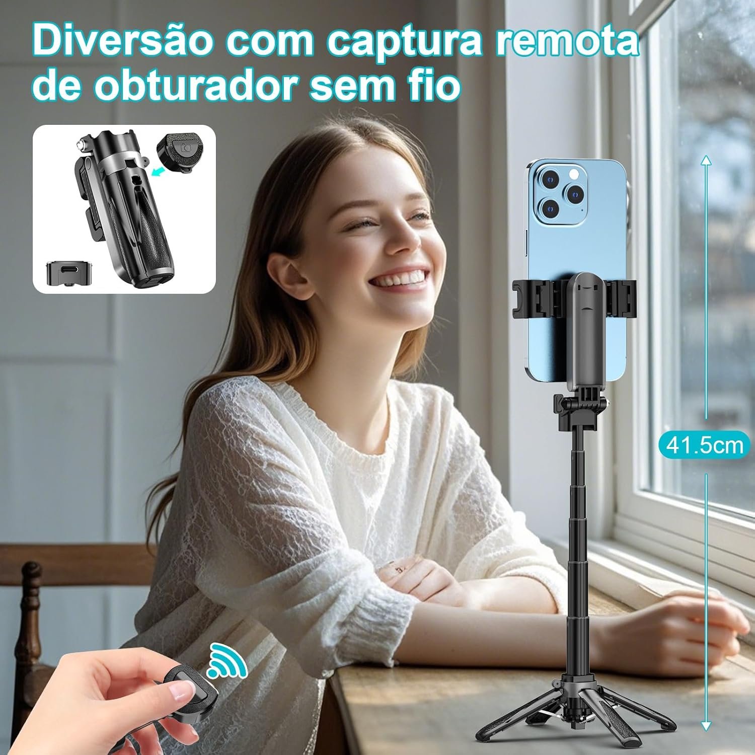 O Tripé 4 em 1 é compatível com iPhone e Android, tornando-o uma solução universal para diferentes smartphones. Graças ao suporte dobrável e controle Bluetooth removível, você pode capturar ângulos incríveis com facilidade, atendendo tanto a amadores quanto a criadores de conteúdo profissionais que buscam desempenho confiável.